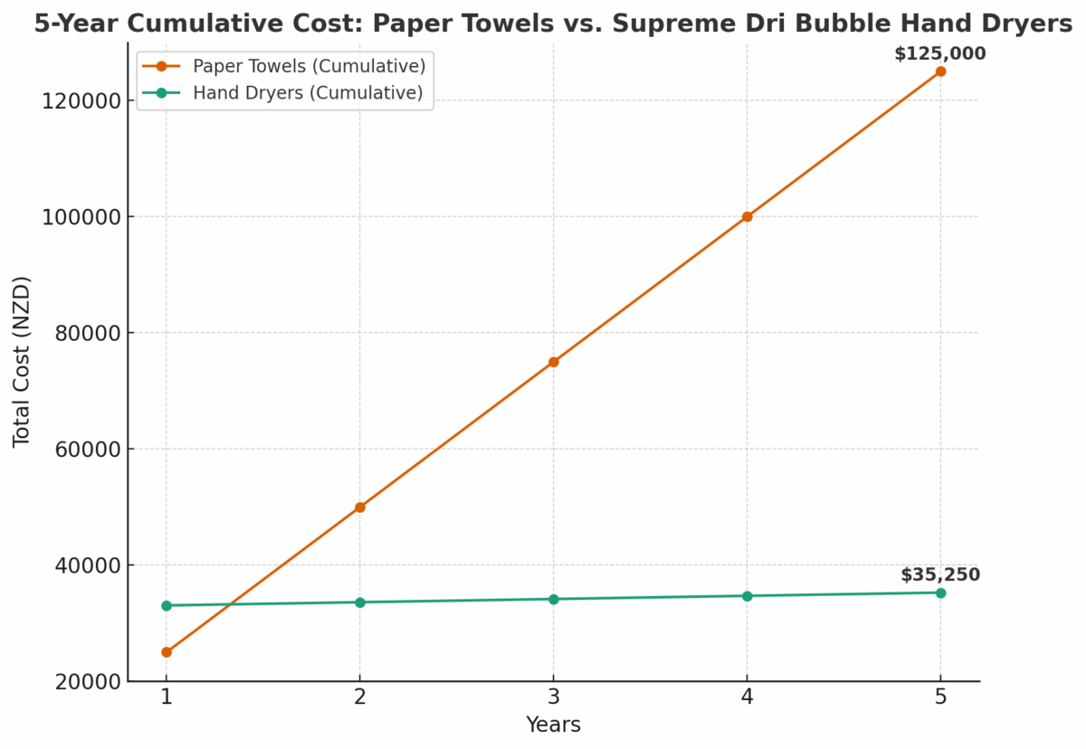 By comparison, running 25 hand dryers costs approximately $550 per year in electricity, with a one off capital cost (including installation) of about $32,500. This means the dryers pay for themselves in less than 18 months, then continue saving the venue thousands of dollars every year.